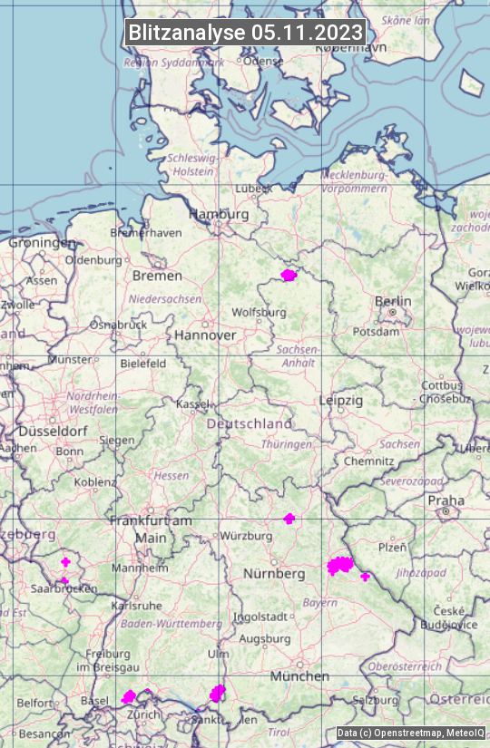 Die Blitzübersicht zeigt alle registrierten Blitze am 05.11.2023. Sie basiert auf dem Blitzortungssystem Blids der Firma Siemens.