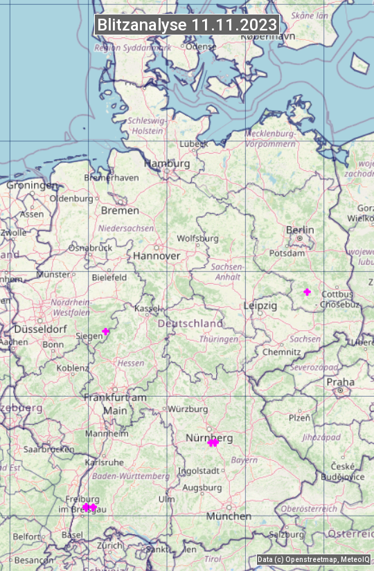 Die Blitzübersicht zeigt alle registrierten Blitze am 11.11.2023. Sie basiert auf dem Blitzortungssystem Blids der Firma Siemens.