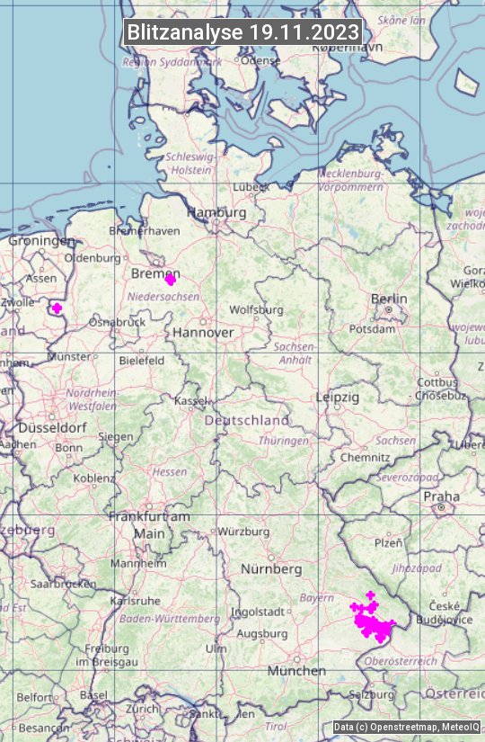 Die Blitzübersicht zeigt alle registrierten Blitze am 19.11.2023. Sie basiert auf dem Blitzortungssystem Blids der Firma Siemens.