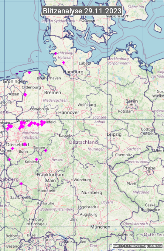 Die Blitzübersicht zeigt alle registrierten Blitze am 29.11.2023. Sie basiert auf dem Blitzortungssystem Blids der Firma Siemens.