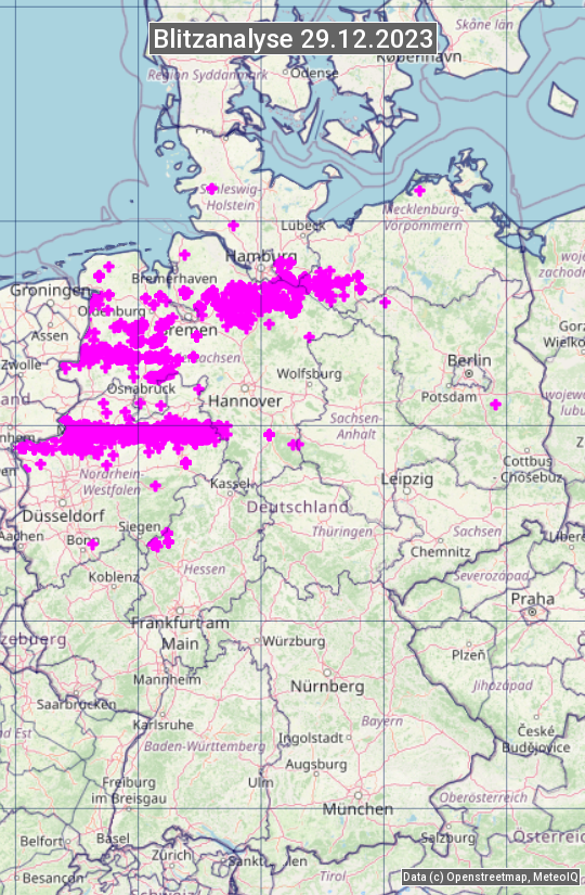 Die Blitzübersicht zeigt alle registrierten Blitze am 29.12.2023. Sie basiert auf dem Blitzortungssystem Blids der Firma Siemens.