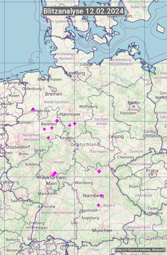 Die Blitzübersicht zeigt alle registrierten Blitze am 12.02.2024. Sie basiert auf dem Blitzortungssystem Blids der Firma Siemens.