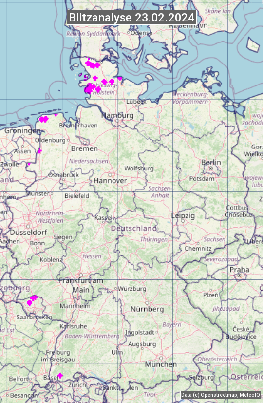 Die Blitzübersicht zeigt alle registrierten Blitze am 23.02.2024. Sie basiert auf dem Blitzortungssystem Blids der Firma Siemens.