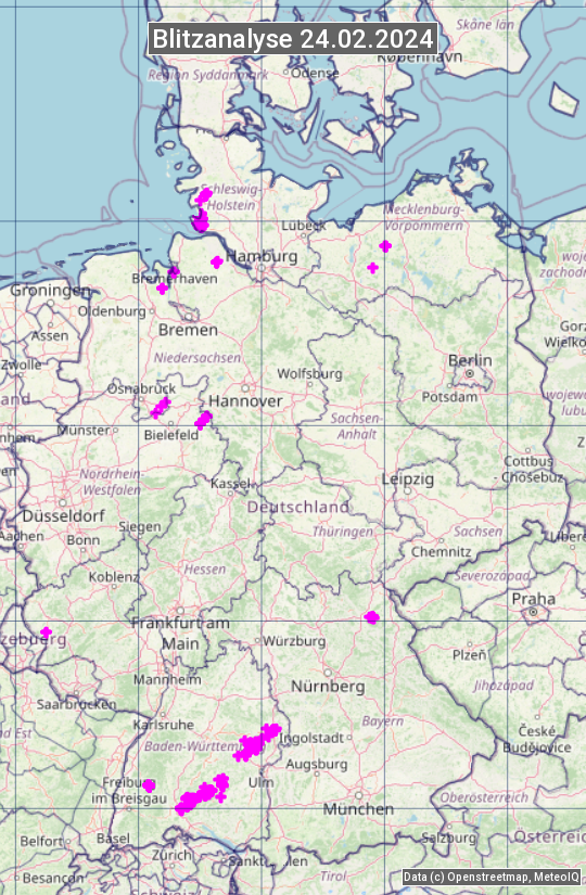 Die Blitzübersicht zeigt alle registrierten Blitze am 24.02.2024. Sie basiert auf dem Blitzortungssystem Blids der Firma Siemens.