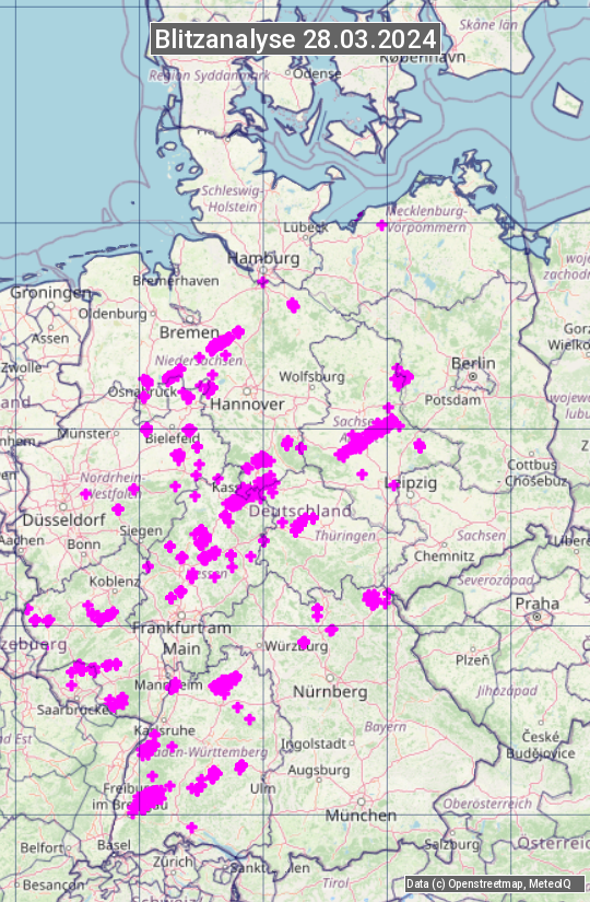 Die Blitzübersicht zeigt alle registrierten Blitze am 28.03.2024. Sie basiert auf dem Blitzortungssystem Blids der Firma Siemens.