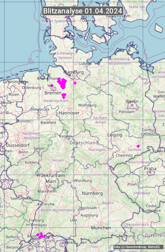 Die Blitzübersicht zeigt alle registrierten Blitze am 01.04.2024. Sie basiert auf dem Blitzortungssystem Blids der Firma Siemens.