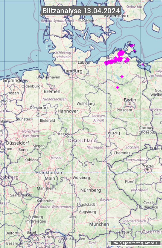 Die Blitzübersicht zeigt alle registrierten Blitze am 13.04.2024. Sie basiert auf dem Blitzortungssystem Blids der Firma Siemens.