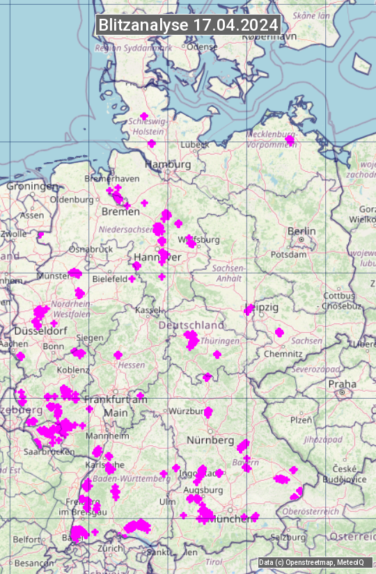 Die Blitzübersicht zeigt alle registrierten Blitze am 17.04.2024. Sie basiert auf dem Blitzortungssystem Blids der Firma Siemens.