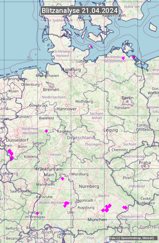 Die Blitzübersicht zeigt alle registrierten Blitze am 21.04.2024. Sie basiert auf dem Blitzortungssystem Blids der Firma Siemens.