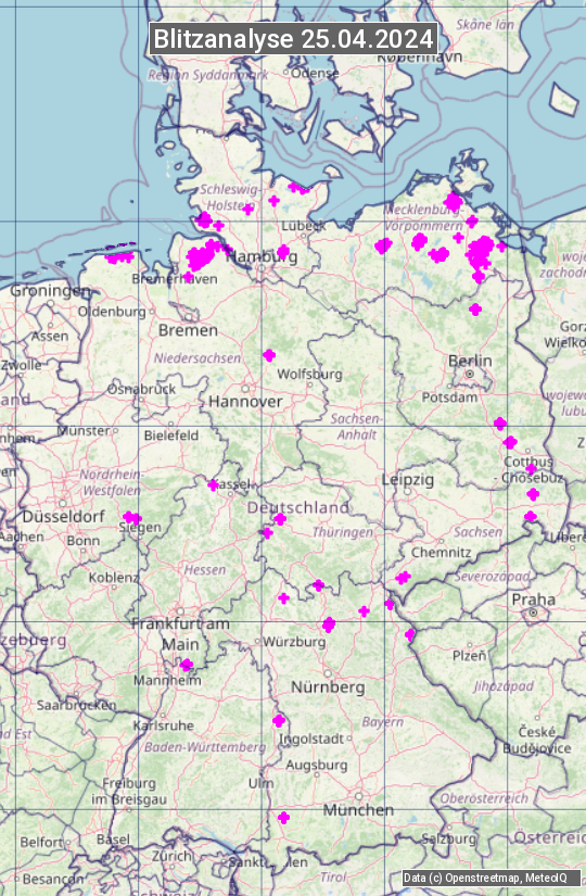 Die Blitzübersicht zeigt alle registrierten Blitze am 25.04.2024. Sie basiert auf dem Blitzortungssystem Blids der Firma Siemens.