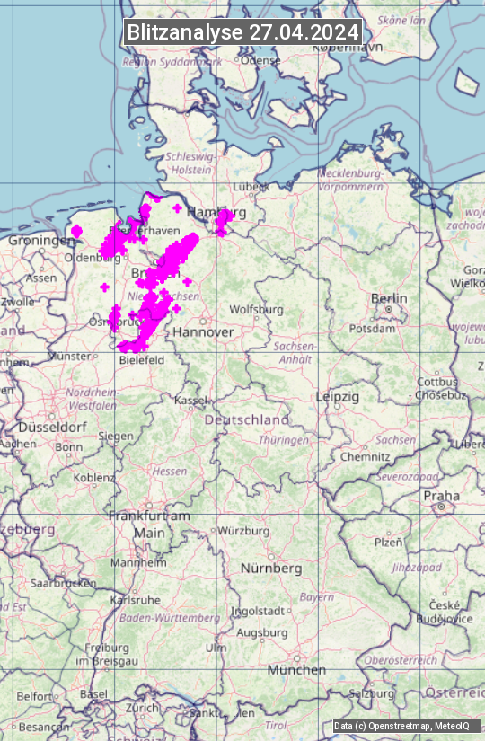 Die Blitzübersicht zeigt alle registrierten Blitze am 27.04.2024. Sie basiert auf dem Blitzortungssystem Blids der Firma Siemens.