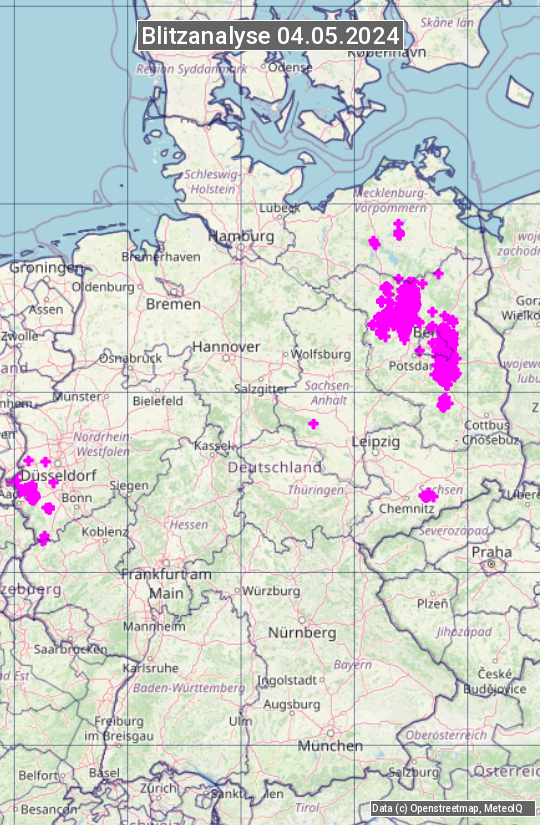Die Blitzübersicht zeigt alle registrierten Blitze am 04.05.2024. Sie basiert auf dem Blitzortungssystem Blids der Firma Siemens.