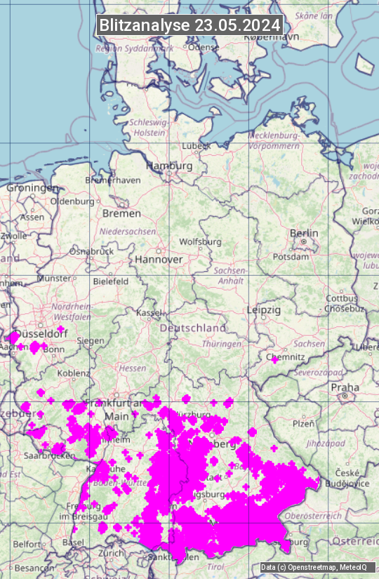 Die Blitzübersicht zeigt alle registrierten Blitze am 23.05.2024. Sie basiert auf dem Blitzortungssystem Blids der Firma Siemens.