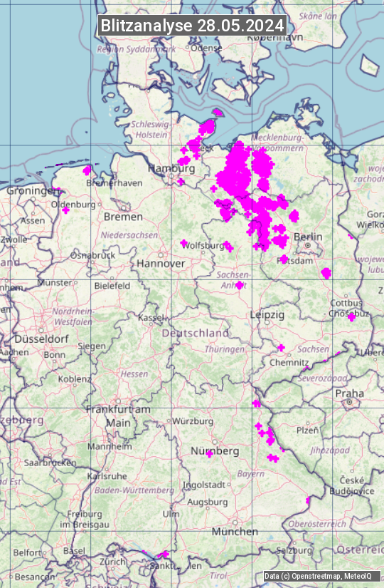 Die Blitzübersicht zeigt alle registrierten Blitze am 28.05.2024. Sie basiert auf dem Blitzortungssystem Blids der Firma Siemens.