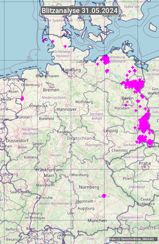 Die Blitzübersicht zeigt alle registrierten Blitze am 31.05.2024. Sie basiert auf dem Blitzortungssystem Blids der Firma Siemens.