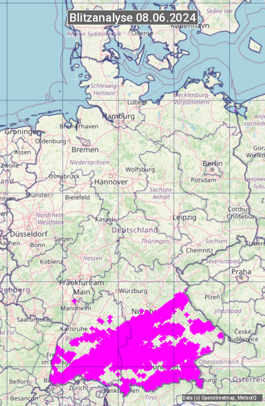 Die Blitzübersicht zeigt alle registrierten Blitze am 08.06.2024. Sie basiert auf dem Blitzortungssystem Blids der Firma Siemens.