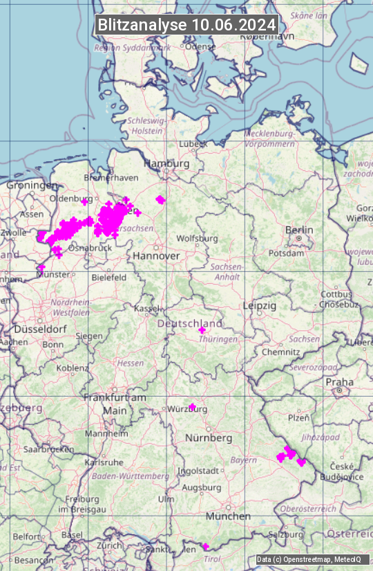 Die Blitzübersicht zeigt alle registrierten Blitze am 10.06.2024. Sie basiert auf dem Blitzortungssystem Blids der Firma Siemens.
