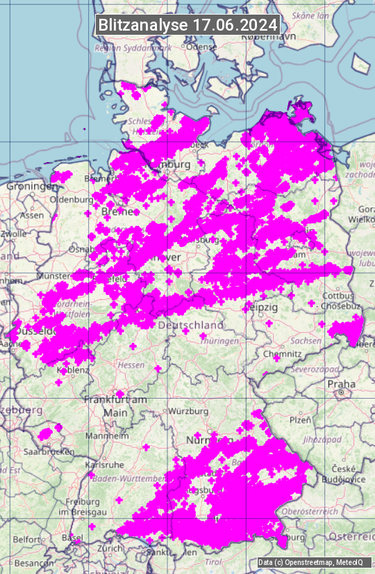 Die Blitzübersicht zeigt alle registrierten Blitze am 17.06.2024. Sie basiert auf dem Blitzortungssystem Blids der Firma Siemens.