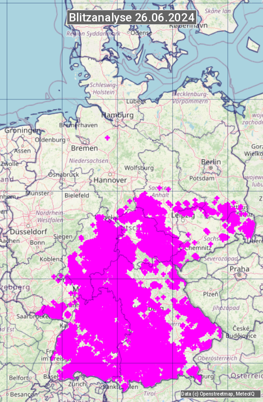 Die Blitzübersicht zeigt alle registrierten Blitze am 26.06.2024. Sie basiert auf dem Blitzortungssystem Blids der Firma Siemens.