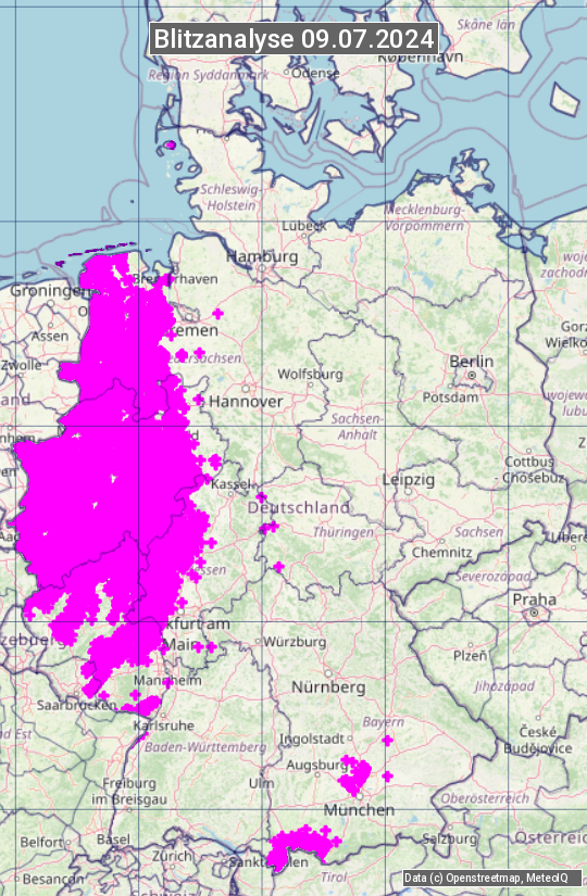 Die Blitzübersicht zeigt alle registrierten Blitze am 09.07.2024. Sie basiert auf dem Blitzortungssystem Blids der Firma Siemens.