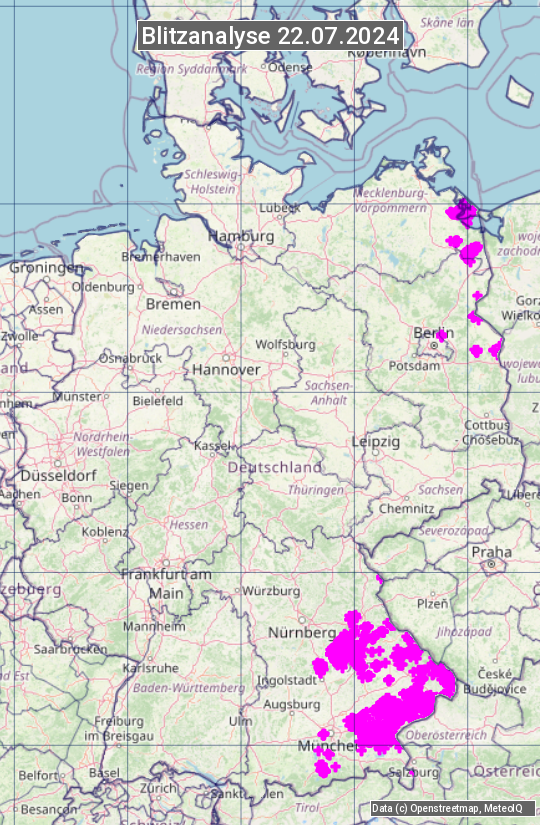 Die Blitzübersicht zeigt alle registrierten Blitze am 22.07.2024. Sie basiert auf dem Blitzortungssystem Blids der Firma Siemens.