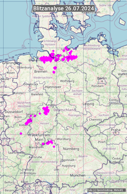 Die Blitzübersicht zeigt alle registrierten Blitze am 26.07.2024. Sie basiert auf dem Blitzortungssystem Blids der Firma Siemens.