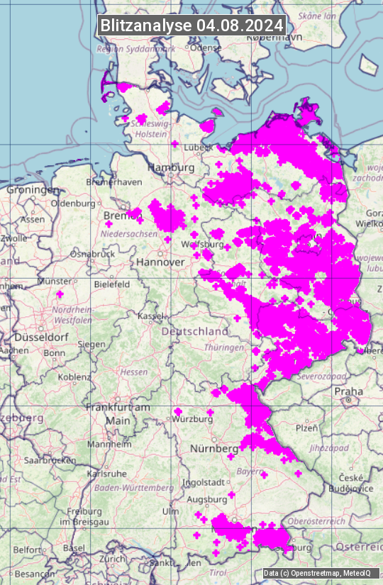 Die Blitzübersicht zeigt alle registrierten Blitze am 04.08.2024. Sie basiert auf dem Blitzortungssystem Blids der Firma Siemens.