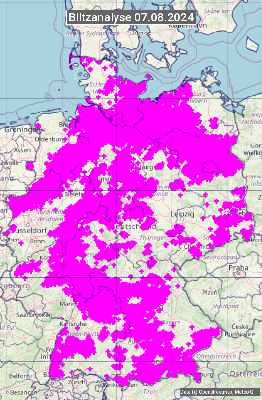 Die Blitzübersicht zeigt alle registrierten Blitze am 07.08.2024. Sie basiert auf dem Blitzortungssystem Blids der Firma Siemens.