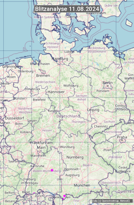 Die Blitzübersicht zeigt alle registrierten Blitze am 11.08.2024. Sie basiert auf dem Blitzortungssystem Blids der Firma Siemens.