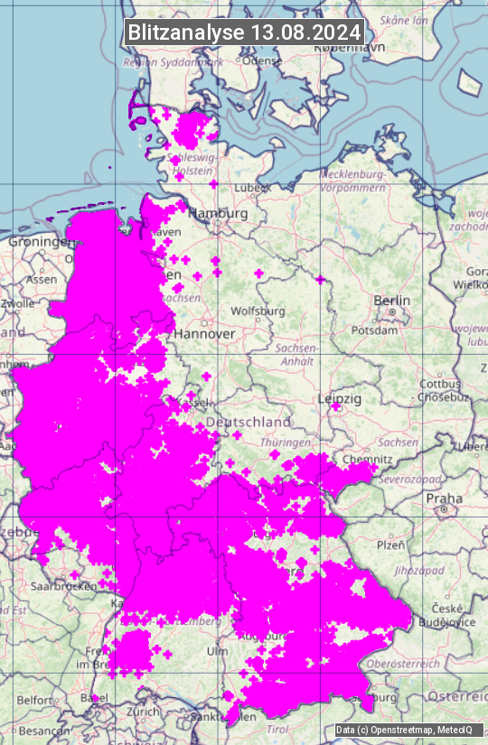 Die Blitzübersicht zeigt alle registrierten Blitze am 13.08.2024. Sie basiert auf dem Blitzortungssystem Blids der Firma Siemens.