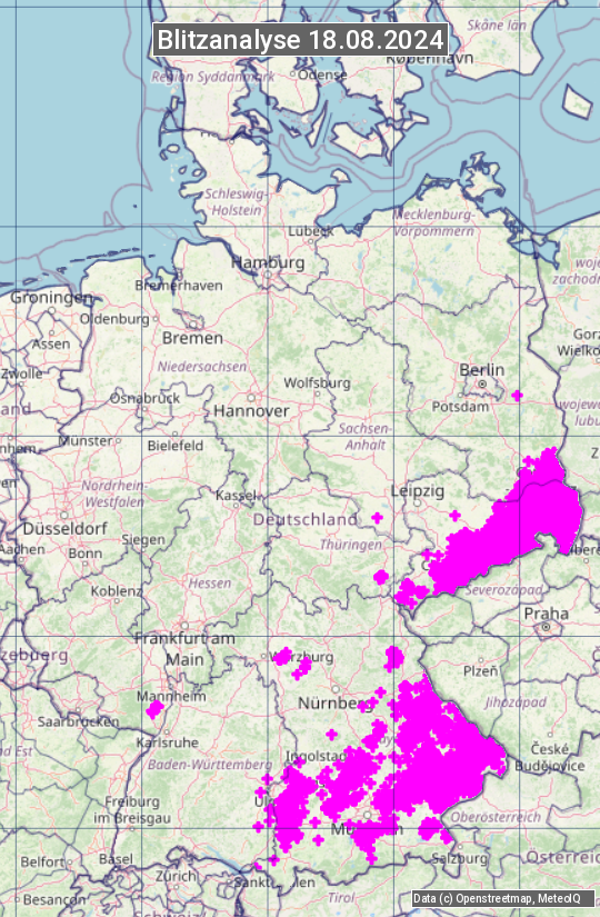 Die Blitzübersicht zeigt alle registrierten Blitze am 18.08.2024. Sie basiert auf dem Blitzortungssystem Blids der Firma Siemens.