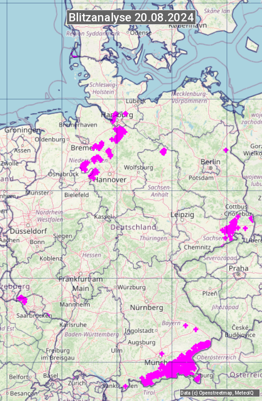 Die Blitzübersicht zeigt alle registrierten Blitze am 20.08.2024. Sie basiert auf dem Blitzortungssystem Blids der Firma Siemens.
