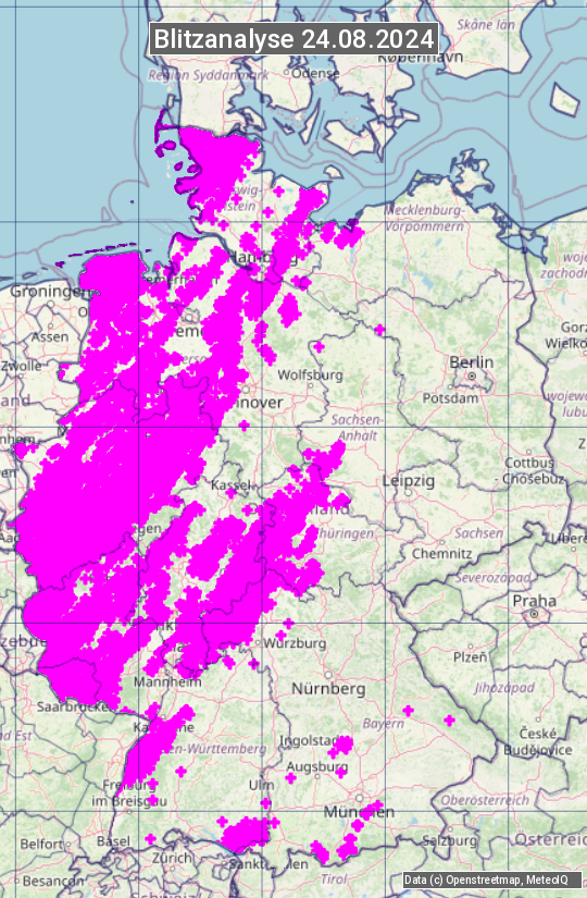 Die Blitzübersicht zeigt alle registrierten Blitze am 24.08.2024. Sie basiert auf dem Blitzortungssystem Blids der Firma Siemens.