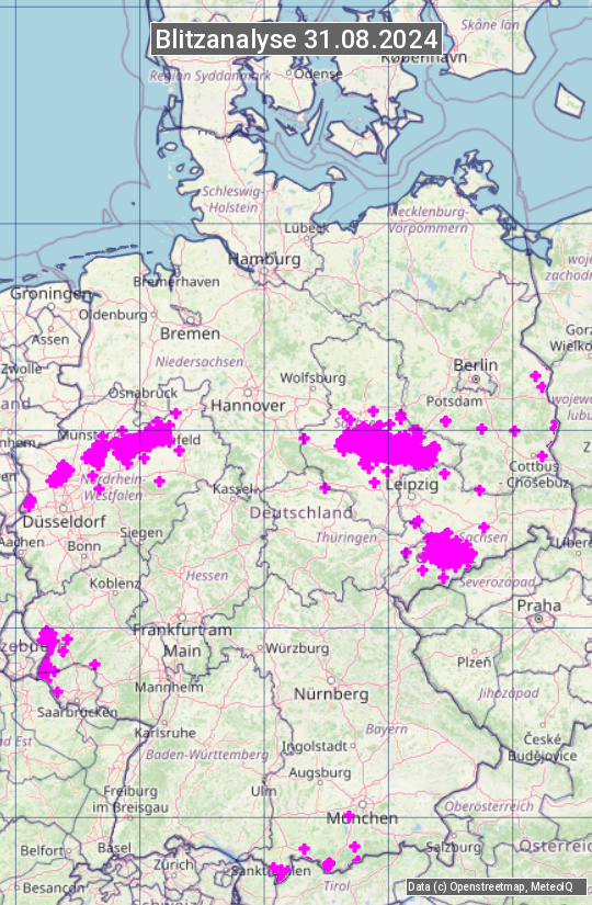 Die Blitzübersicht zeigt alle registrierten Blitze am 31.08.2024. Sie basiert auf dem Blitzortungssystem Blids der Firma Siemens.
