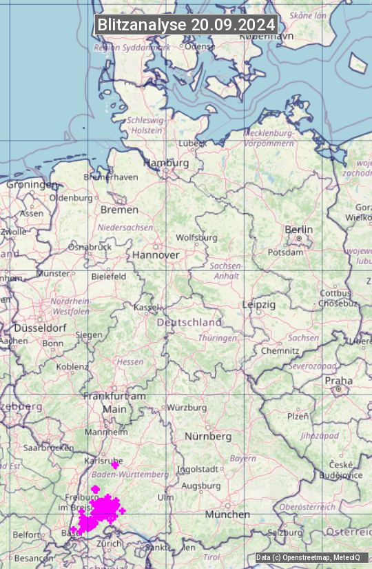 Die Blitzübersicht zeigt alle registrierten Blitze am 20.09.2024. Sie basiert auf dem Blitzortungssystem Blids der Firma Siemens.