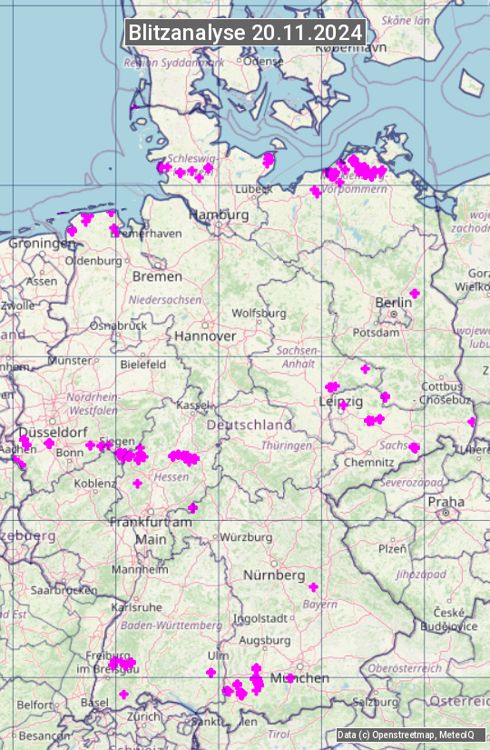 Die Blitzübersicht zeigt alle registrierten Blitze am 20.11.2024. Sie basiert auf dem Blitzortungssystem Blids der Firma Siemens.