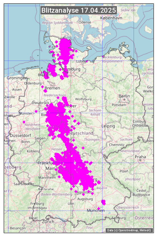 Die Blitzübersicht zeigt alle registrierten Blitze am 17.04.2025. Sie basiert auf dem Blitzortungssystem Blids der Firma Siemens.