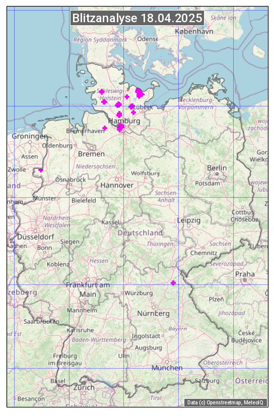 Die Blitzübersicht zeigt alle registrierten Blitze am 18.04.2025. Sie basiert auf dem Blitzortungssystem Blids der Firma Siemens.