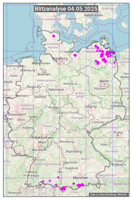 Die Blitzübersicht zeigt alle registrierten Blitze am 04.05.2025. Sie basiert auf dem Blitzortungssystem Blids der Firma Siemens.