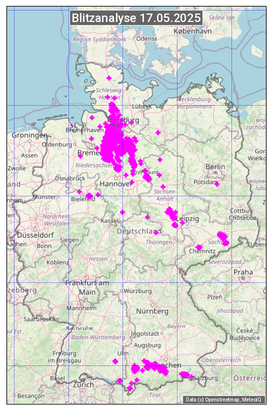 Die Blitzübersicht zeigt alle registrierten Blitze am 17.05.2025. Sie basiert auf dem Blitzortungssystem Blids der Firma Siemens.