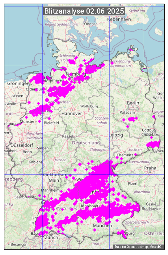 Die Blitzübersicht zeigt alle registrierten Blitze am 02.06.2025. Sie basiert auf dem Blitzortungssystem Blids der Firma Siemens.