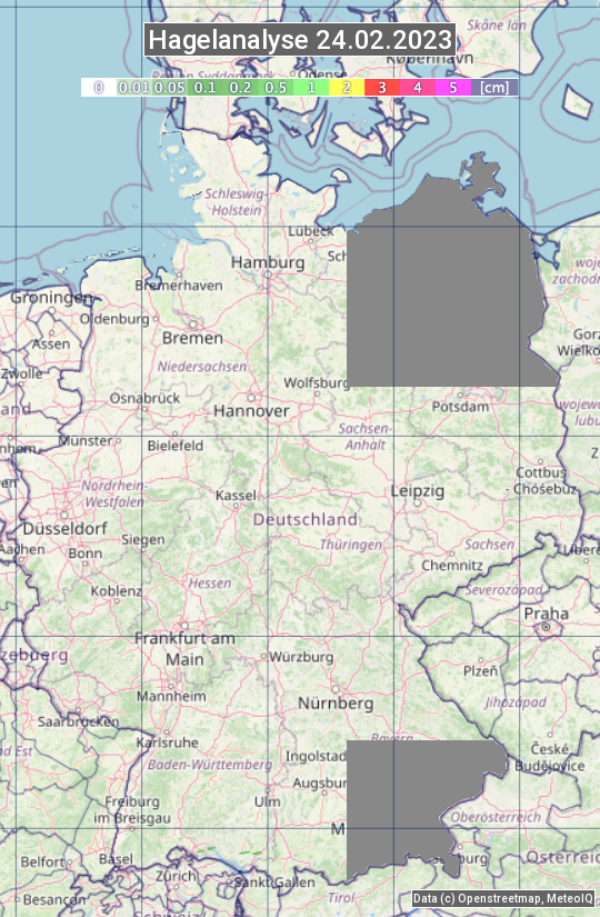 Die Hagelanalyse vom 24.02.2023 zeigt die Hagelspuren mit der maximalen Hagelkorngröße des Tages. Die Angabe erfolgt in Zentimeter.