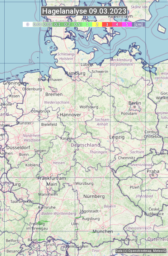 Die Hagelanalyse vom 09.03.2023 zeigt die Hagelspuren mit der maximalen Hagelkorngröße des Tages. Die Angabe erfolgt in Zentimeter.