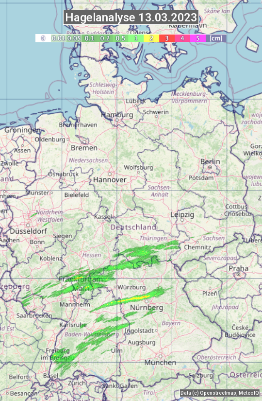 Die Hagelanalyse vom 13.03.2023 zeigt die Hagelspuren mit der maximalen Hagelkorngröße des Tages. Die Angabe erfolgt in Zentimeter.