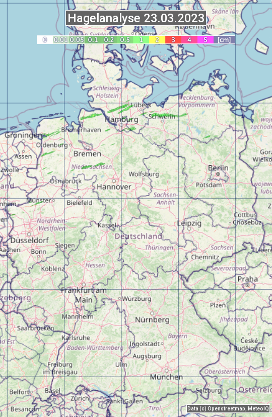 Die Hagelanalyse vom 23.03.2023 zeigt die Hagelspuren mit der maximalen Hagelkorngröße des Tages. Die Angabe erfolgt in Zentimeter.