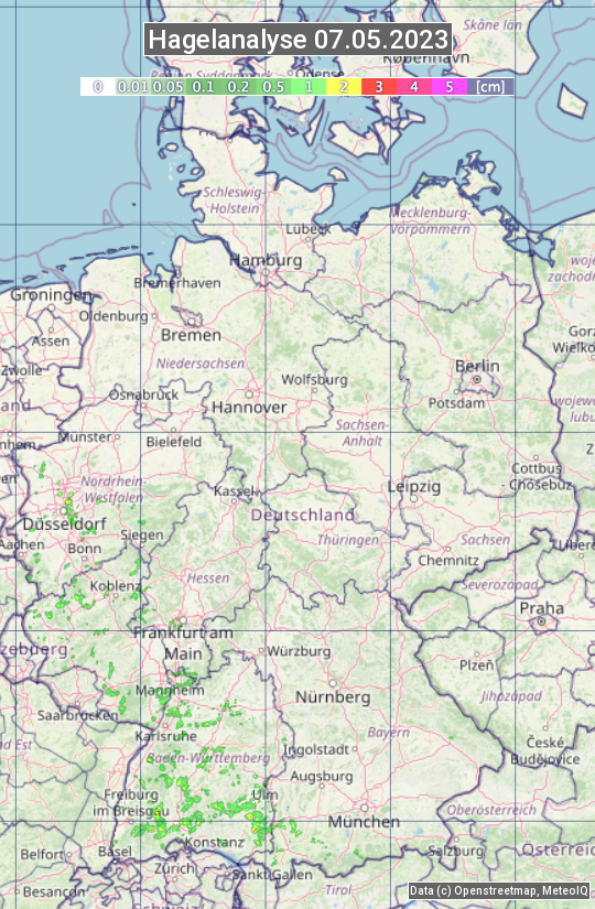 Die Hagelanalyse vom 07.05.2023 zeigt die Hagelspuren mit der maximalen Hagelkorngröße des Tages. Die Angabe erfolgt in Zentimeter.