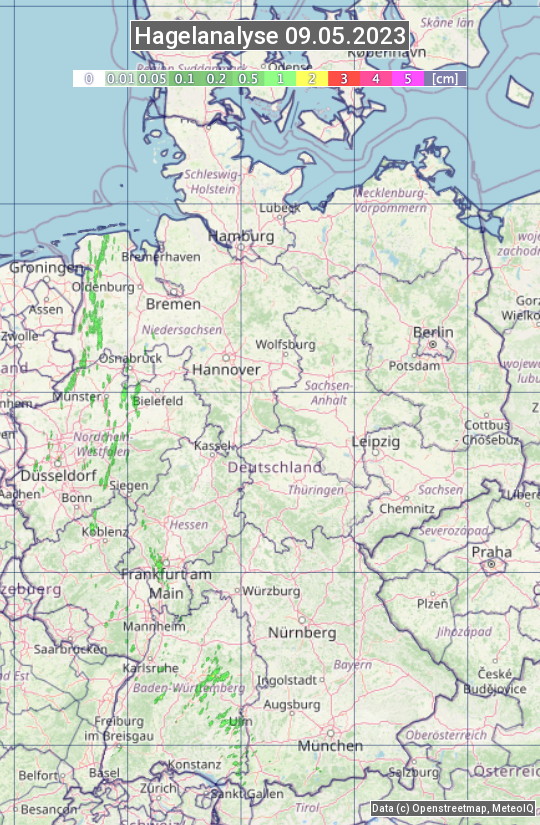 Die Hagelanalyse vom 09.05.2023 zeigt die Hagelspuren mit der maximalen Hagelkorngröße des Tages. Die Angabe erfolgt in Zentimeter.