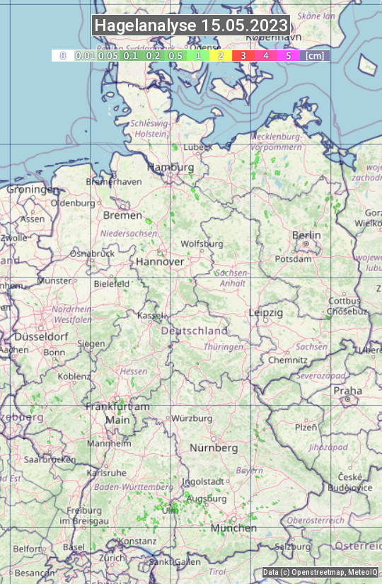 Die Hagelanalyse vom 15.05.2023 zeigt die Hagelspuren mit der maximalen Hagelkorngröße des Tages. Die Angabe erfolgt in Zentimeter.