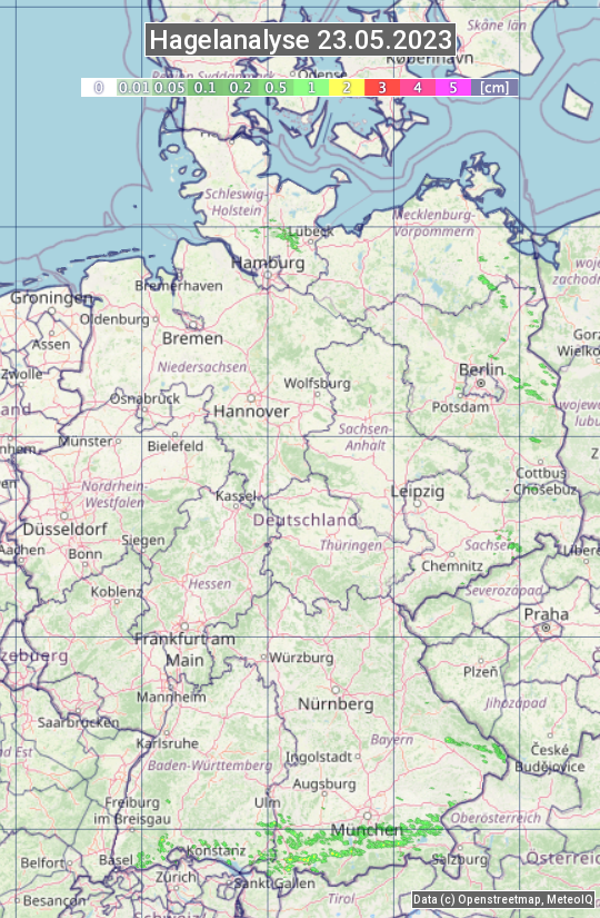 Die Hagelanalyse vom 23.05.2023 zeigt die Hagelspuren mit der maximalen Hagelkorngröße des Tages. Die Angabe erfolgt in Zentimeter.