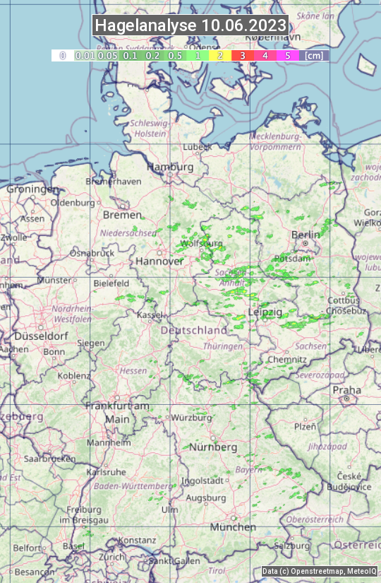 Die Hagelanalyse vom 10.06.2023 zeigt die Hagelspuren mit der maximalen Hagelkorngröße des Tages. Die Angabe erfolgt in Zentimeter.
